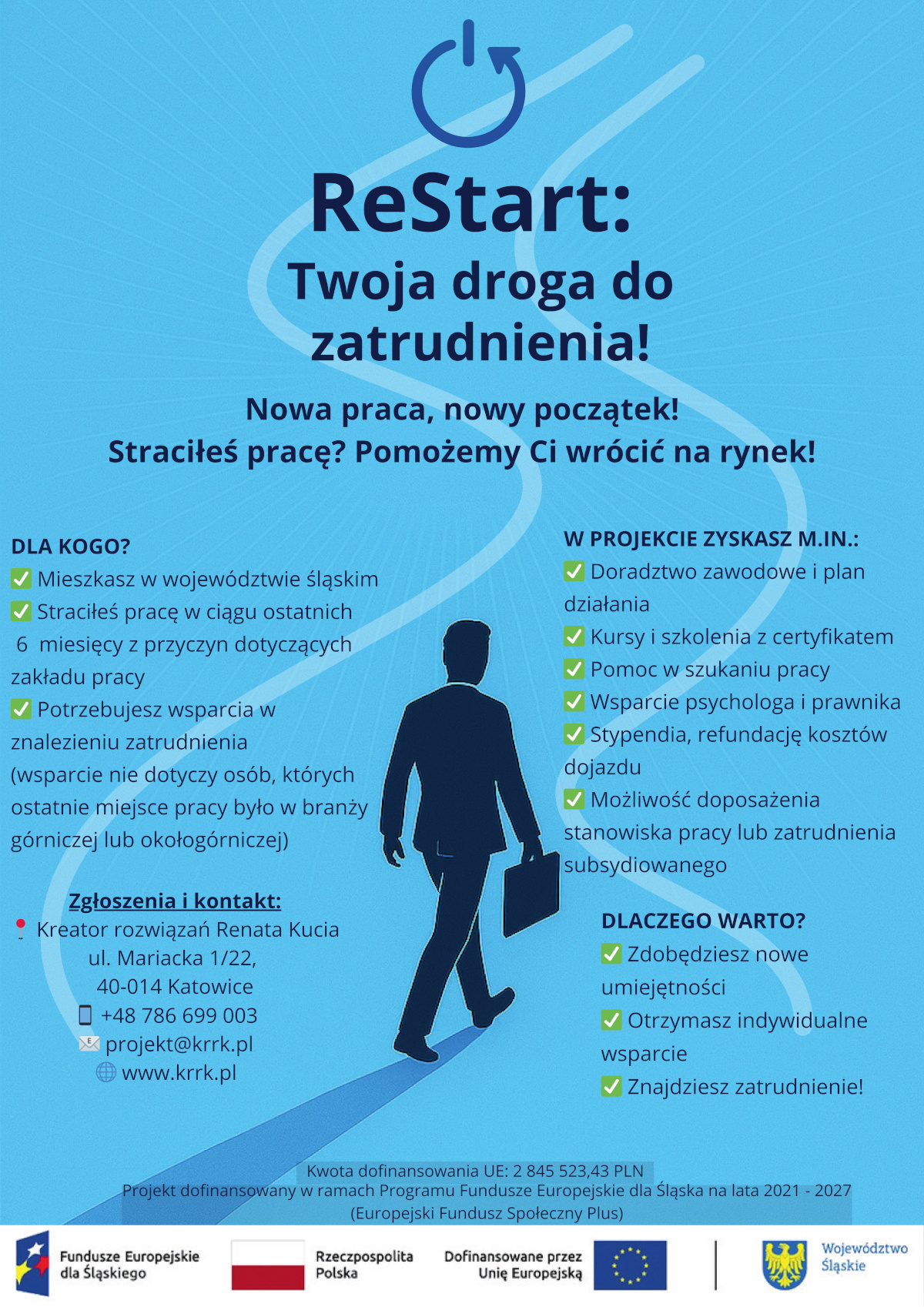 Projekt realizowany jest w ramach Działania: FESL.05.16-Outplacement EFS+ dofinansowany z Funduszy Europejskich dla Śląskiego na lata 2021 – 2027 (Europejskiego Funduszu Społecznego Plus).