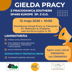 12 maja br. (wtorek), o godz. 10:00 w Powiatowym Urzędzie Pracy w Cieszynie zapraszamy na giełdę pracy z pracodawcą SOUTHERN SPARS EUROPE Sp. z o.o. z Bażanowic na stanowisko...